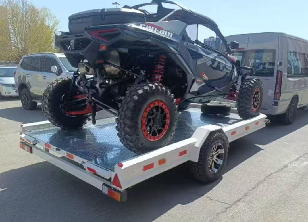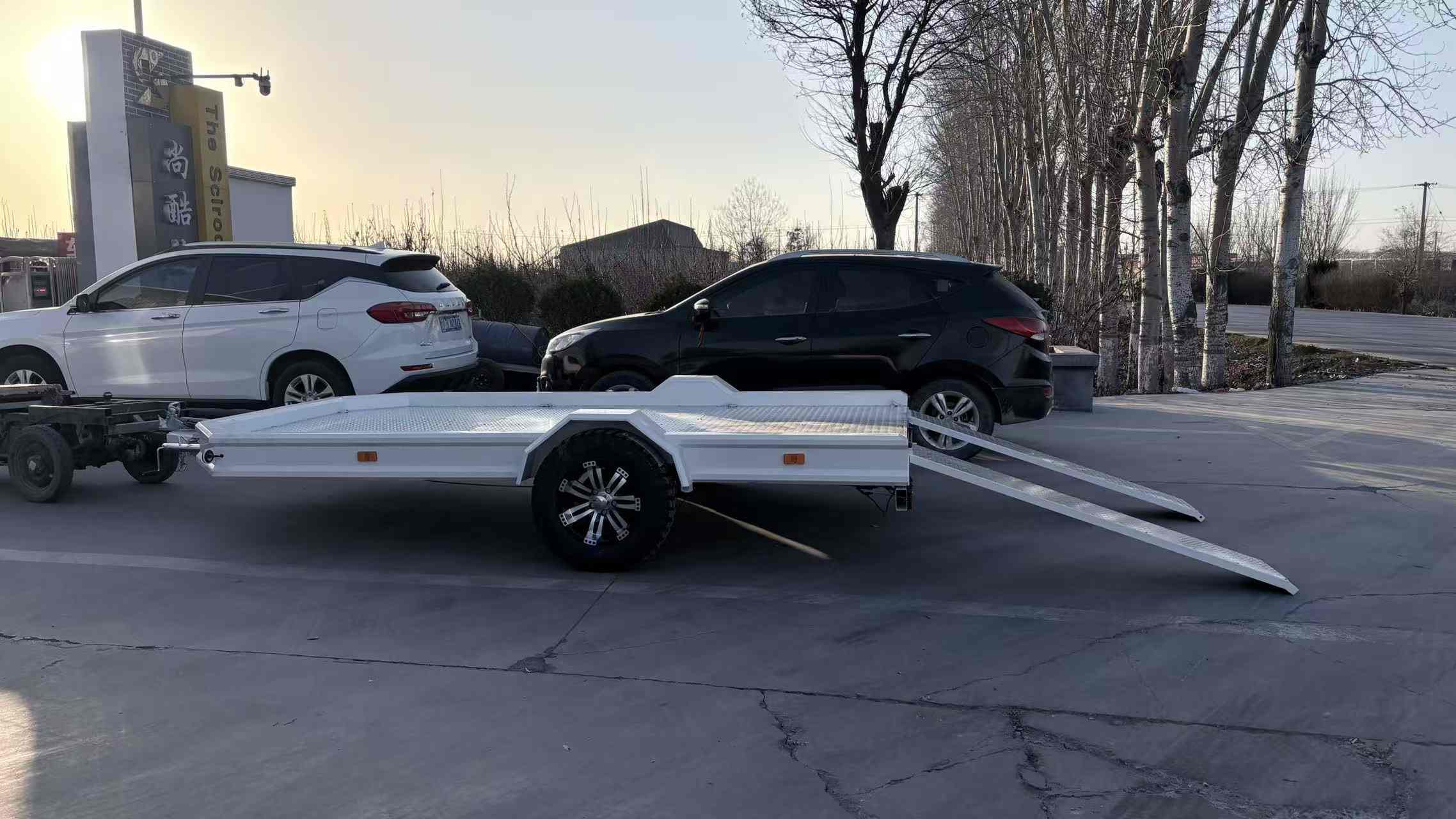 A síkágyas fedélzet csúszásgátló alumíniumlemezből (vagy tartós acéllemezből) készül, amely nagy tapadású felületet kínál, hogy megakadályozza a rakomány elmozdulását szállítás közben. Az alumínium fedélzet könnyű és korrózióálló, ideális kültéri használatra nedves vagy tengerparti környezetben, míg az acél fedélzet maximális tartósságot biztosít nehéz, koptató terhelések esetén. Az alacsony profilú kialakításnak és az integrált rámpáknak köszönhetően az ATV-k, UTV-k és kis berendezések berakodása gyors és egyszerű.